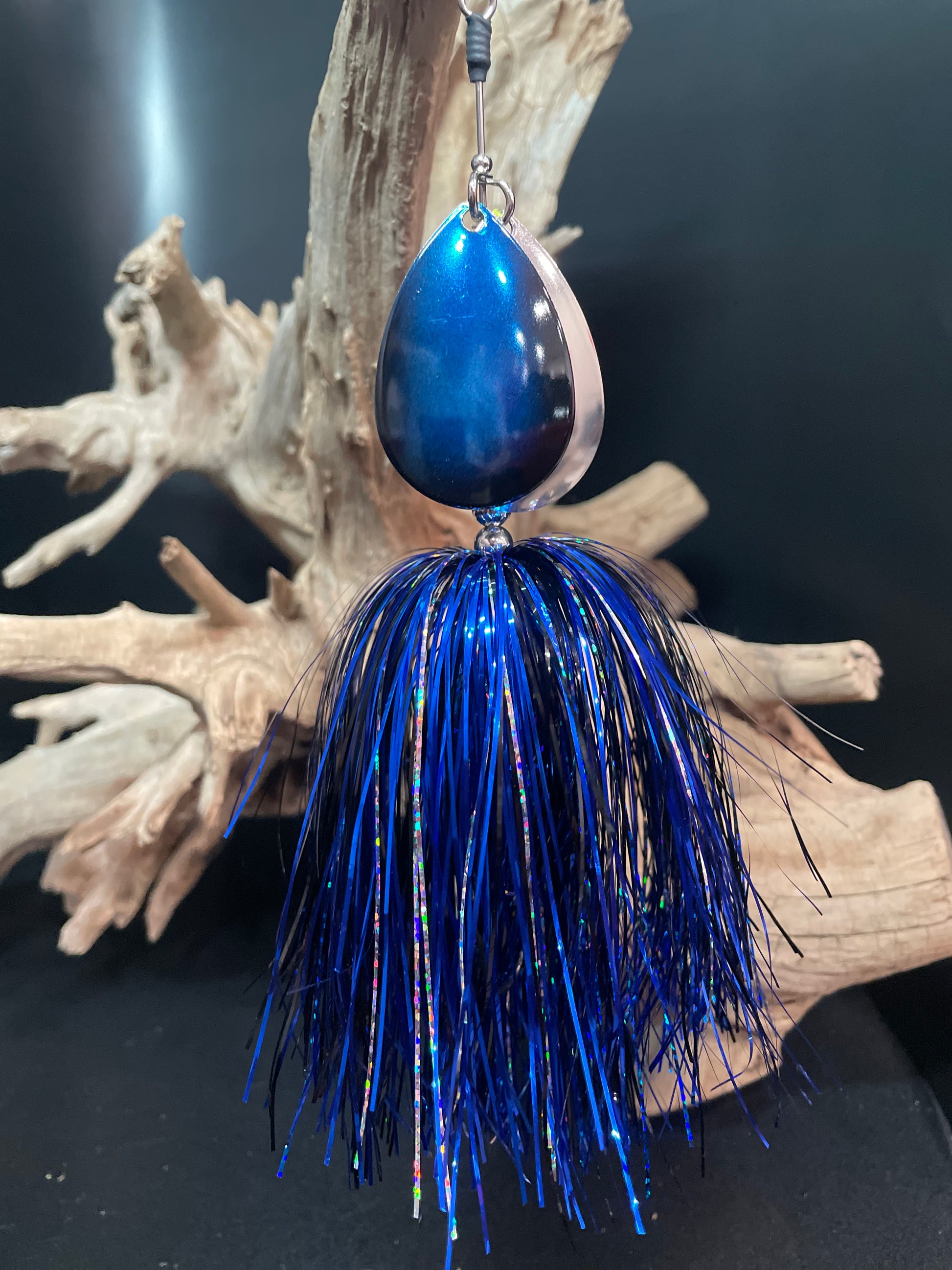 The Midnight Storm Bucktail lure features a sleek combination of black, blue, and silver with two #8 blades, one in blue and black, the other silver with UV glow, for enhanced underwater flash and attraction. Its 1 oz tail weight improves casting distance and accuracy, while the short frame paired with a strong #4/0 Mustad hook ensures reliable hook sets. Expertly designed for anglers seeking superior performance in challenging conditions.
